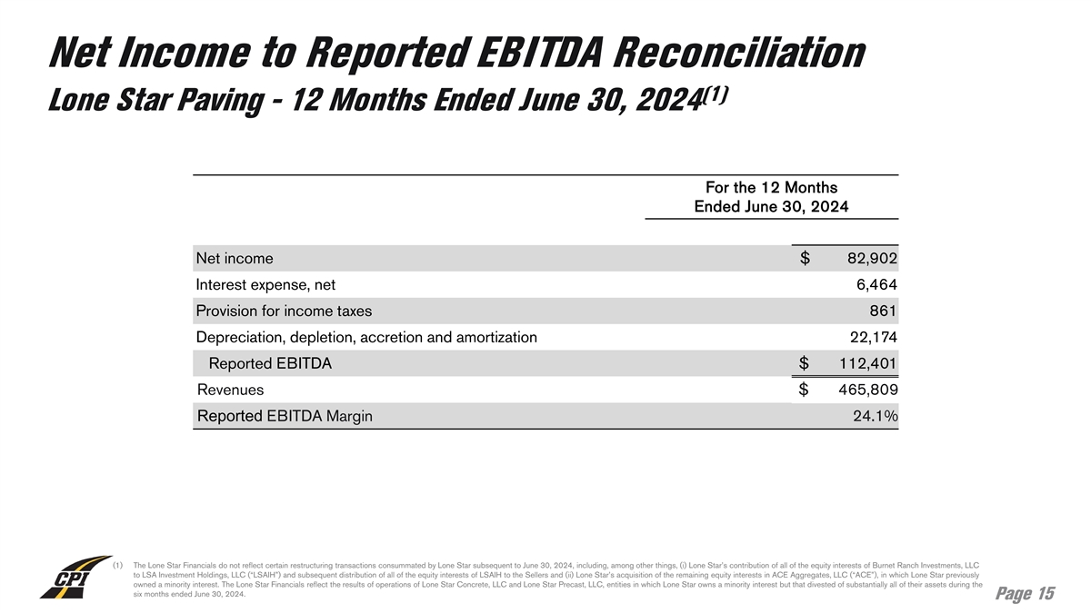Net Income to Reported EBITDA Reconciliation (1) Lone Star Paving - 12 Months Ended June 30, 2024 For the 12 Months Ended June 30, 2024 Net income $ 82,902 Interest expense, net 6,464 Provision for income taxes 861 Depreciation, depletion, accretion and amortization 22,174 Reported EBITDA $ 112,401 Revenues $ 465,809 Reported EBITDA Margin 24.1% (1) The Lone Star Financials do not reflect certain restructuring transactions consummated by Lone Star subsequent to June 30, 2024, including, among other things, (i) Lone Star’s contribution of all of the equity interests of Burnet Ranch Investments, LLC to LSA Investment Holdings, LLC (“LSAIH”) and subsequent distribution of all of the equity interests of LSAIH to the Sellers and (ii) Lone Star’s acquisition of the remaining equity interests in ACE Aggregates, LLC (“ACE”), in which Lone Star previously owned a minority interest. The Lone Star Financials reflect the results of operations of Lone Star Concrete, LLC and Lone Star Precast, LLC, entities in which Lone Star owns a minority interest but that divested of substantially all of their assets during the six months ended June 30, 2024. Page 15