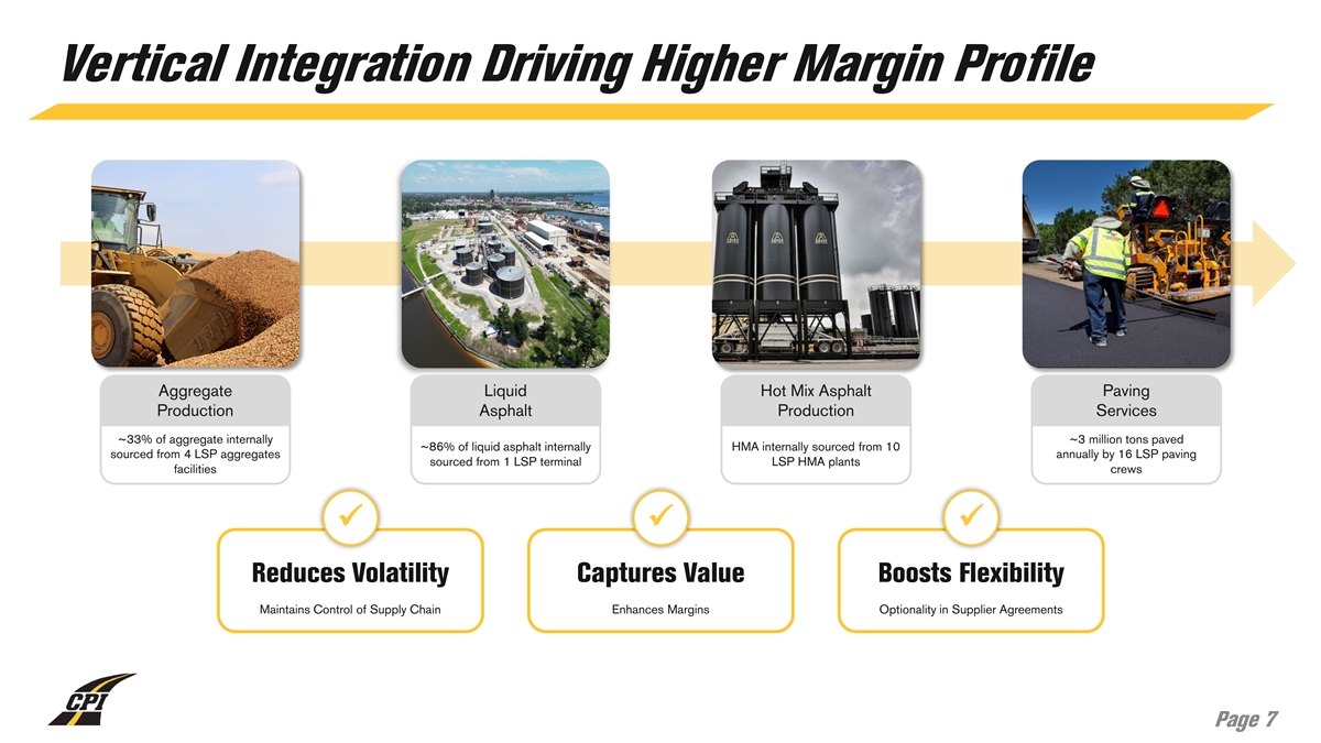 Transformational Transaction Expanding CPI into Texas Complementary Geographic Expansion in Attractive Texas Market ü • Adds a new platform to the Family of CPI Companies that will serve as a growth engine in TX Private Private 47% • Texas is the most well-funded state DOT; attractive “Texas 37% Triangle” metro areas (1) Revenue Mix 53% 63% Public Strategically Aligned Operations and Cultural Fit Public ü • Similar vertically integrated operation base with HMA plants, quarries and liquid asphalt NC TN SC • Strong management team and productive non-union labor base AL GA TX Geography Footprint Scale and Diversification with New Customer Base ü FL • Adds significant scale with strong backlog / pipeline • Texas Department of Transportation (“TxDOT”) would be a top 5 HMA Plants 75 10 CPI customer, on a pro forma basis Aggregate Facilities 13 4 Attractive Financial Metrics ü Liquid Asphalt Terminals 2 1 • Similar project approach / sizes and risk management policy Employees 5,000+ 625+ • High margin business with strong cash flow generation (1) Reflects data for CPI’s FY ended September 30, 2023 and LSP’s FY ended December 31, 2023 Page 6