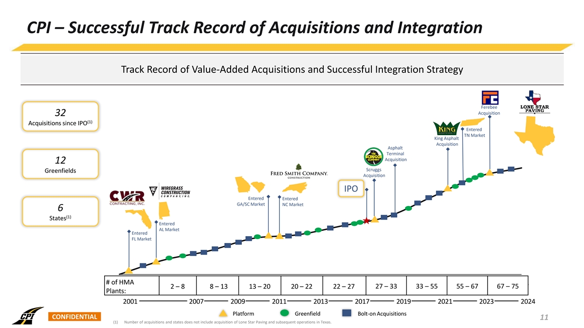CPI – A Family of Companies Charlotte, NC Raleigh, NC (1) (1) December 2022 January 2011 Dothan, AL Greenville, SC (1) (1) December 2002 October 2021 Tallahassee, FL Valdosta, GA (1) (1) May 2001 May 2018 75 HMA Plants 13 Aggregate Facilities 2 Liquid Asphalt Terminals (1) Represents the date the company was acquired by Construction Partners. CONFIDENTIAL 10