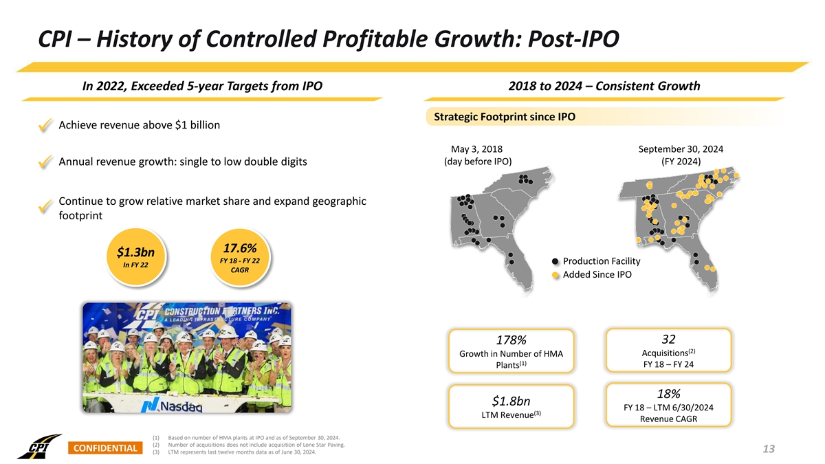CPI – Successful Track Record of Acquisitions and Integration Track Record of Value-Added Acquisitions and Successful Integration Strategy Ferebee Acquisition 32 (1) Acquisitions since IPO Entered TN Market King Asphalt Acquisition Asphalt Terminal Acquisition 12 Scruggs Greenfields Acquisition IPO Entered Entered GA/SC Market NC Market 6 (1) States Entered AL Market Entered FL Market # of HMA 2001 2007 2009 2011 2013 2017 2019 2021 2023 2025 2 – 8 8 – 13 13 – 20 20 – 22 22 – 27 27 – 33 33 – 55 55 – 67 67 – 75 Plants: 2001 2007 2009 2011 2013 2017 2019 2021 2023 2024 Platform Greenfield Bolt-on Acquisitions CONFIDENTIAL 11 (1) Number of acquisitions and states does not include acquisition of Lone Star Paving and subsequent operations in Texas.