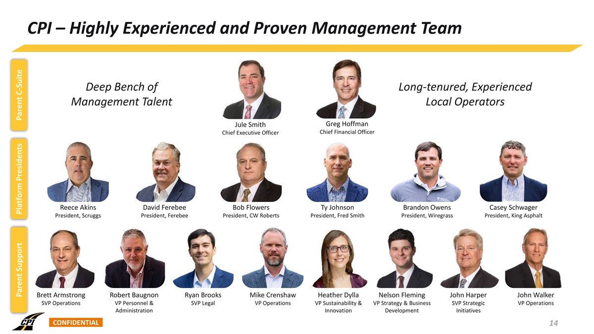 CPI – History of Controlled Profitable Growth: Post-IPO In 2022, Exceeded 5-year Targets from IPO 2018 to 2024 – Consistent Growth Strategic Footprint since IPO Achieve revenue above $1 billion ü May 3, 2018 September 30, 2024 (day before IPO) (FY 2024) Annual revenue growth: single to low double digits ü Continue to grow relative market share and expand geographic ü footprint 17.6% $1.3bn FY 18 - FY 22 Production Facility In FY 22 CAGR Added Since IPO 32 178% (2) Acquisitions Growth in Number of HMA (1) FY 18 – FY 24 Plants 18% $1.8bn FY 18 – LTM 6/30/2024 (3) LTM Revenue Revenue CAGR (1) Based on number of HMA plants at IPO and as of September 30, 2024. (2) Number of acquisitions does not include acquisition of Lone Star Paving. CONFIDENTIAL 13 (3) LTM represents last twelve months data as of June 30, 2024.