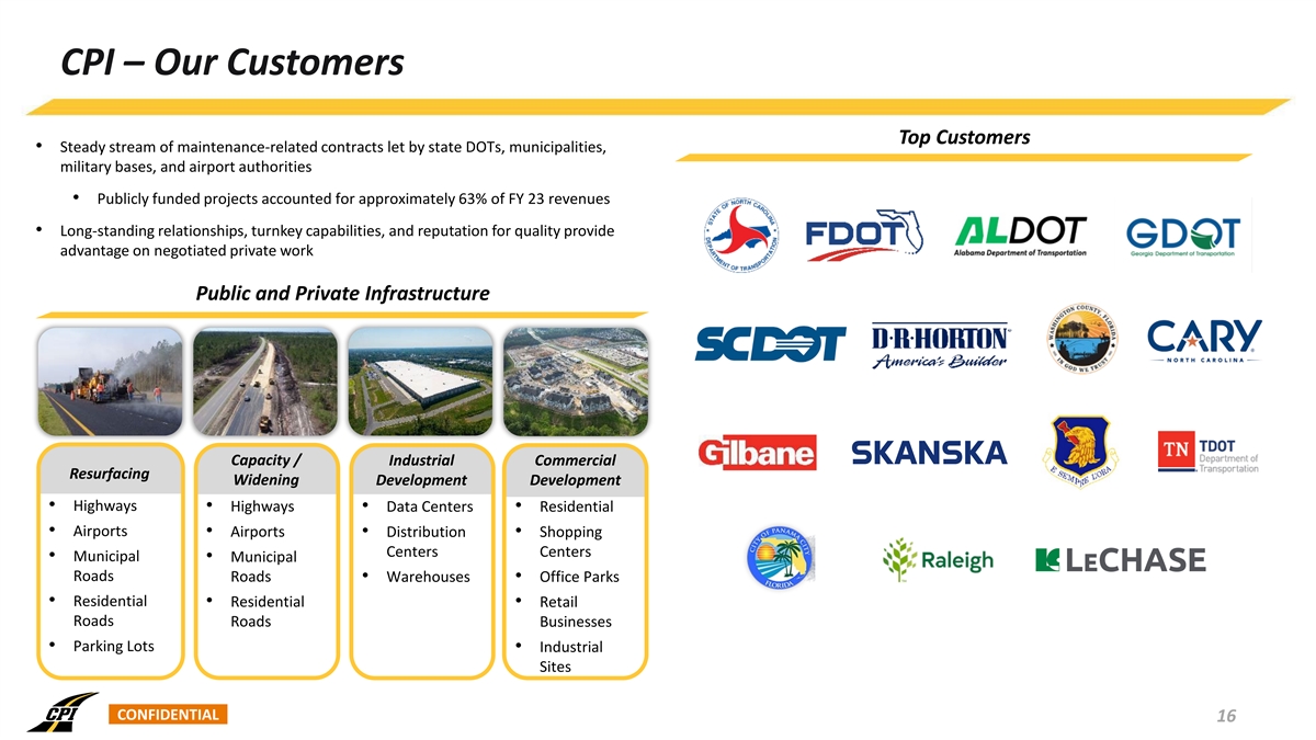 CPI – Local Markets / Workforce Leads to High Relative Market Share Local markets defined as ~50-mile radius around plants given temperature sensitivity of HMA HMA Plant Favorable Local Market Dynamic Aggregate Facility • Local market knowledge and relationships provides competitive moat • Hiring and retention advantage as a local operator building jobs where our employees live • Flexibility to optimize utilization of crews and equipment within adjacent markets Oak Park, GA • Strategically positioned to win routine, maintenance-related projects; no out-of-market mega projects Leading to High Relative Market Share CONFIDENTIAL 15