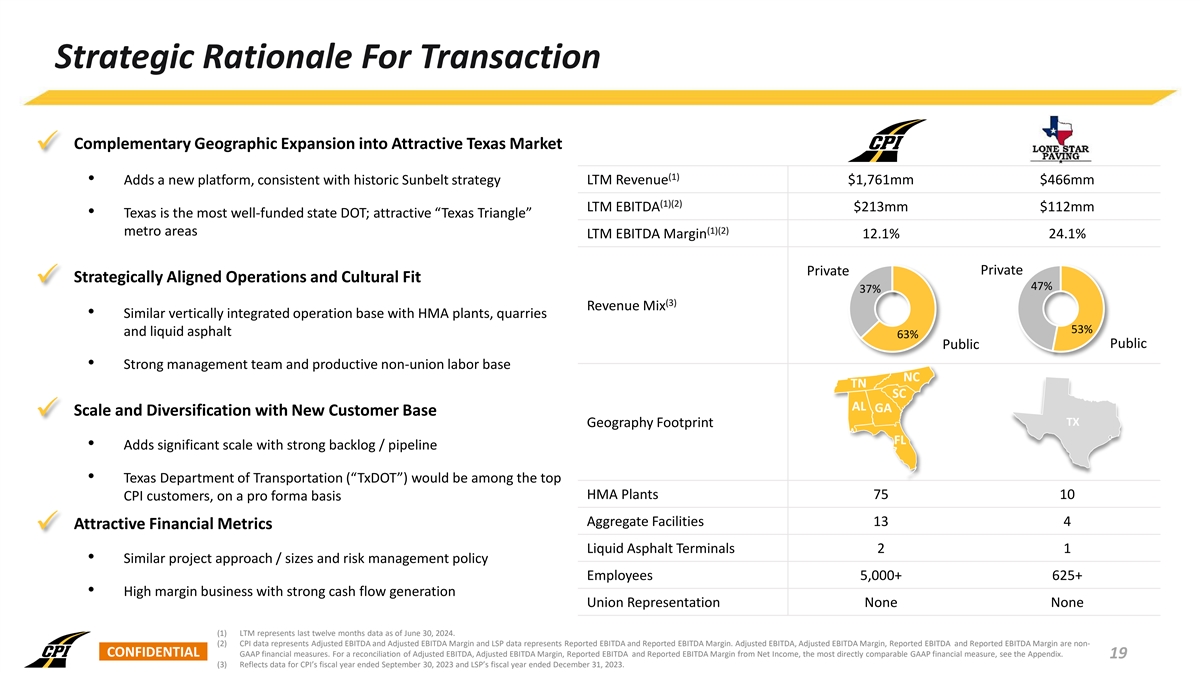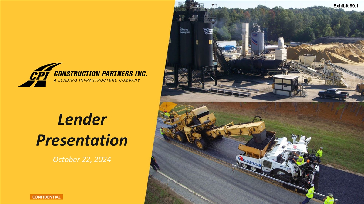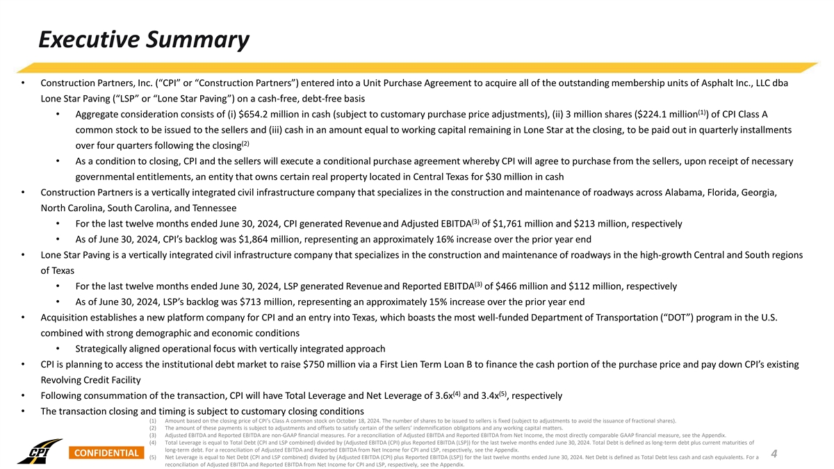 Executive Summary • Construction Partners, Inc. (“CPI” or “Construction Partners”) entered into a Unit Purchase Agreement to acquire all of the outstanding membership units of Asphalt Inc., LLC dba Lone Star Paving (“LSP” or “Lone Star Paving”) on a cash-free, debt-free basis (1) • Aggregate consideration consists of (i) $654.2 million in cash (subject to customary purchase price adjustments), (ii) 3 million shares ($224.1 million ) of CPI Class A common stock to be issued to the sellers and (iii) cash in an amount equal to working capital remaining in Lone Star at the closing, to be paid out in quarterly installments (2) over four quarters following the closing • As a condition to closing, CPI and the sellers will execute a conditional purchase agreement whereby CPI will agree to purchase from the sellers, upon receipt of necessary governmental entitlements, an entity that owns certain real property located in Central Texas for $30 million in cash • Construction Partners is a vertically integrated civil infrastructure company that specializes in the construction and maintenance of roadways across Alabama, Florida, Georgia, North Carolina, South Carolina, and Tennessee (3) • For the last twelve months ended June 30, 2024, CPI generated Revenue and Adjusted EBITDA of $1,761 million and $213 million, respectively • As of June 30, 2024, CPI’s backlog was $1,864 million, representing an approximately 16% increase over the prior year end • Lone Star Paving is a vertically integrated civil infrastructure company that specializes in the construction and maintenance of roadways in the high-growth Central and South regions of Texas (3) • For the last twelve months ended June 30, 2024, LSP generated Revenue and Reported EBITDA of $466 million and $112 million, respectively • As of June 30, 2024, LSP’s backlog was $713 million, representing an approximately 15% increase over the prior year end • Acquisition establishes a new platform company for CPI and an entry into Texas, which boasts the most well-funded Department of Transportation (“DOT”) program in the U.S. combined with strong demographic and economic conditions • Strategically aligned operational focus with vertically integrated approach • CPI is planning to access the institutional debt market to raise $750 million via a First Lien Term Loan B to finance the cash portion of the purchase price and pay down CPI’s existing Revolving Credit Facility (4) (5) • Following consummation of the transaction, CPI will have Total Leverage and Net Leverage of 3.6x and 3.4x , respectively • The transaction closing and timing is subject to customary closing conditions (1) Amount based on the closing price of CPI’s Class A common stock on October 18, 2024. The number of shares to be issued to sellers is fixed (subject to adjustments to avoid the issuance of fractional shares). (2) The amount of these payments is subject to adjustments and offsets to satisfy certain of the sellers’ indemnification obligations and any working capital matters. (3) Adjusted EBITDA and Reported EBITDA are non-GAAP financial measures. For a reconciliation of Adjusted EBITDA and Reported EBITDA from Net Income, the most directly comparable GAAP financial measure, see the Appendix. (4) Total Leverage is equal to Total Debt (CPI and LSP combined) divided by (Adjusted EBITDA (CPI) plus Reported EBITDA (LSP)) for the last twelve months ended June 30, 2024. Total Debt is defined as long-term debt plus current maturities of long-term debt. For a reconciliation of Adjusted EBITDA and Reported EBITDA from Net Income for CPI and LSP, respectively, see the Appendix. CONFIDENTIAL 4 (5) Net Leverage is equal to Net Debt (CPI and LSP combined) divided by (Adjusted EBITDA (CPI) plus Reported EBITDA (LSP)) for the last twelve months ended June 30, 2024. Net Debt is defined as Total Debt less cash and cash equivalents. For a reconciliation of Adjusted EBITDA and Reported EBITDA from Net Income for CPI and LSP, respectively, see the Appendix.