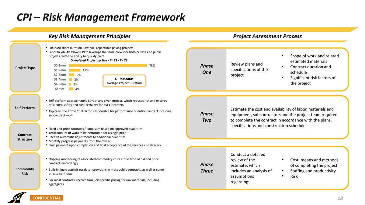 CPI – Risk Management Framework Key Risk Management Principles Project Assessment Process • Focus on short-duration, low-risk, repeatable paving projects • Labor flexibility allows CPI to leverage the same crews for both private and public projects, with the ability to quickly pivot • Scope of work and related Completed Project by Size - FY 21 - FY 23 estimated materials Review plans and $0-1mm 75% Phase • Contract duration and Project Type $1-2mm specifications of the 11% schedule One $2-3mm 5% project • Significant risk factors of 6 – 9 Months $3-4mm 3% Average Project Duration the project $4-5mm 2% $5mm+ 4% • Self-perform approximately 80% of any given project, which reduces risk and ensures efficiency, safety and cost-certainty for our customers Self-Perform Estimate the cost and availability of labor, materials and • Typically, the Prime Contractor, responsible for performance of entire contract including Phase equipment, subcontractors and the project team required subcontract work to complete the contract in accordance with the plans, Two specifications and construction schedule • Fixed unit price contracts / lump sum based on approved quantities • Total amount of work to be performed for a single price Contract • Receive automatic adjustments to additional quantities Structure • Monthly progress payments from the owner • Final payment upon completion and final acceptance of the services and delivery Conduct a detailed • Ongoing monitoring of associated commodity costs at the time of bid and price review of the • Cost, means and methods contracts accordingly Phase estimate, which of completing the project Commodity • Built-in liquid asphalt escalator provisions in most public contracts, as well as some includes an analysis of • Staffing and productivity Three private contracts Risk assumptions • Risk • For most contracts, receive firm, job-specific pricing for raw materials, including regarding: aggregates CONFIDENTIAL 18