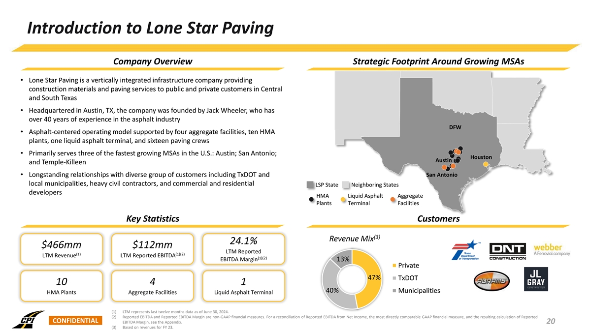 Strategic Rationale For Transaction Complementary Geographic Expansion into Attractive Texas Market ü (1) • Adds a new platform, consistent with historic Sunbelt strategy LTM Revenue $1,761mm $466mm (1)(2) LTM EBITDA $213mm $112mm • Texas is the most well-funded state DOT; attractive “Texas Triangle” (1)(2) metro areas LTM EBITDA Margin 12.1% 24.1% Private Private Strategically Aligned Operations and Cultural Fit ü 47% 37% (3) Revenue Mix • Similar vertically integrated operation base with HMA plants, quarries 53% and liquid asphalt 63% Public Public • Strong management team and productive non-union labor base NC TN SC AL GA Scale and Diversification with New Customer Base ü TX Geography Footprint FL • Adds significant scale with strong backlog / pipeline • Texas Department of Transportation (“TxDOT”) would be among the top HMA Plants 75 10 CPI customers, on a pro forma basis Aggregate Facilities 13 4 Attractive Financial Metrics ü Liquid Asphalt Terminals 2 1 • Similar project approach / sizes and risk management policy Employees 5,000+ 625+ • High margin business with strong cash flow generation Union Representation None None (1) LTM represents last twelve months data as of June 30, 2024. (2) CPI data represents Adjusted EBITDA and Adjusted EBITDA Margin and LSP data represents Reported EBITDA and Reported EBITDA Margin. Adjusted EBITDA, Adjusted EBITDA Margin, Reported EBITDA and Reported EBITDA Margin are non- CONFIDENTIAL GAAP financial measures. For a reconciliation of Adjusted EBITDA, Adjusted EBITDA Margin, Reported EBITDA and Reported EBITDA Margin from Net Income, the most directly comparable GAAP financial measure, see the Appendix. 19 (3) Reflects data for CPI’s fiscal year ended September 30, 2023 and LSP’s fiscal year ended December 31, 2023.
