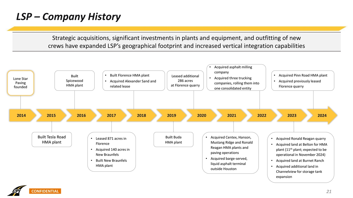 Introduction to Lone Star Paving Company Overview Strategic Footprint Around Growing MSAs • Lone Star Paving is a vertically integrated infrastructure company providing construction materials and paving services to public and private customers in Central and South Texas • Headquartered in Austin, TX, the company was founded by Jack Wheeler, who has over 40 years of experience in the asphalt industry DFW • Asphalt-centered operating model supported by four aggregate facilities, ten HMA plants, one liquid asphalt terminal, and sixteen paving crews • Primarily serves three of the fastest growing MSAs in the U.S.: Austin; San Antonio; Houston Austin and Temple-Killeen • Longstanding relationships with diverse group of customers including TxDOT and San Antonio local municipalities, heavy civil contractors, and commercial and residential LSP State Neighboring States developers HMA Liquid Asphalt Aggregate Plants Terminal Facilities Key Statistics Customers (3) Revenue Mix 24.1% $466mm $112mm LTM Reported (1) (1)(2) LTM Revenue LTM Reported EBITDA (1)(2) EBITDA Margin 13% Private 47% TxDOT 10 4 1 40% Municipalities HMA Plants Aggregate Facilities Liquid Asphalt Terminal (1) LTM represents last twelve months data as of June 30, 2024. (2) Reported EBITDA and Reported EBITDA Margin are non-GAAP financial measures. For a reconciliation of Reported EBITDA from Net Income, the most directly comparable GAAP financial measure, and the resulting calculation of Reported CONFIDENTIAL EBITDA Margin, see the Appendix. 20 (3) Based on revenues for FY 23.