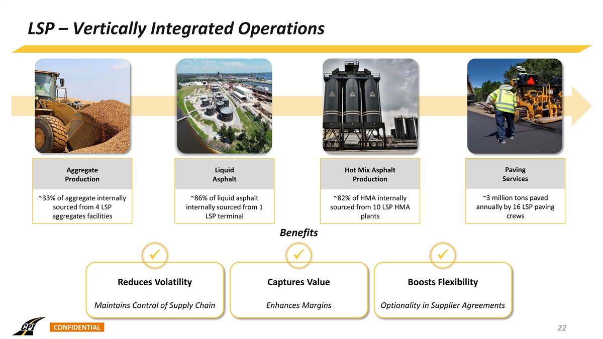 LSP – Company History Strategic acquisitions, significant investments in plants and equipment, and outfitting of new crews have expanded LSP’s geographical footprint and increased vertical integration capabilities • Acquired asphalt milling company • Built Florence HMA plant • Acquired Pinn Road HMA plant Built Leased additional • Acquired three trucking Lone Star Spicewood 286 acres • Acquired Alexander Sand and • Acquired previously leased Paving companies, rolling them into HMA plant at Florence quarry related lease Florence quarry founded one consolidated entity 2014 2015 2016 2017 2018 2019 2020 2021 2022 2023 2024 Built Tesla Road Built Buda • Acquired Centex, Hanson, • Leased 871 acres in • Acquired Ronald Reagan quarry HMA plant HMA plant Mustang Ridge and Ronald Florence • Acquired land at Belton for HMA Reagan HMA plants and th • Acquired 140 acres in plant (11 plant; expected to be paving operations New Braunfels operational in November 2024) • Acquired barge-served, • Built New Braunfels • Acquired land at Burnet Ranch liquid asphalt terminal HMA plant • Acquired additional land in outside Houston Channelview for storage tank expansion CONFIDENTIAL 21