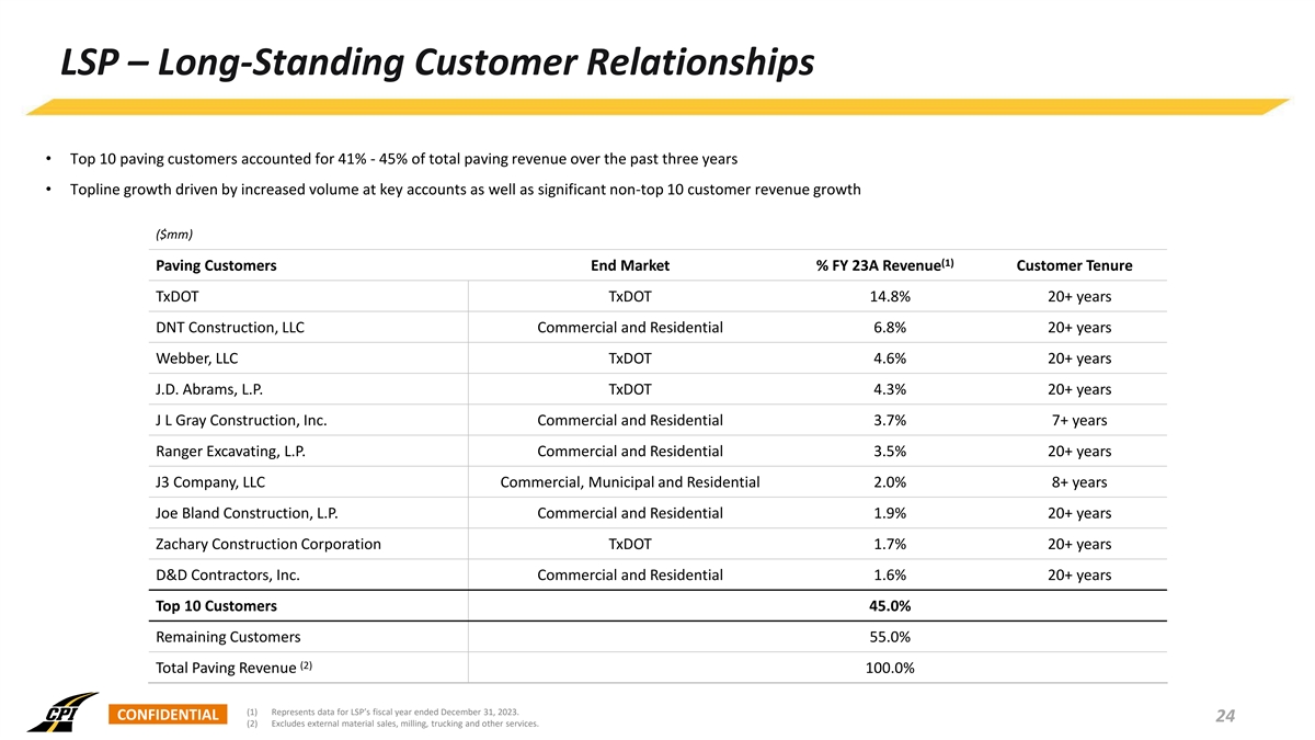 LSP – Long-Standing Customer Relationships • Top 10 paving customers accounted for 41% - 45% of total paving revenue over the past three years • Topline growth driven by increased volume at key accounts as well as significant non-top 10 customer revenue growth ($mm) (1) Paving Customers End Market % FY 23A Revenue Customer Tenure TxDOT TxDOT 14.8% 20+ years DNT Construction, LLC Commercial and Residential 6.8% 20+ years Webber, LLC TxDOT 4.6% 20+ years J.D. Abrams, L.P. TxDOT 4.3% 20+ years J L Gray Construction, Inc. Commercial and Residential 3.7% 7+ years Ranger Excavating, L.P. Commercial and Residential 3.5% 20+ years J3 Company, LLC Commercial, Municipal and Residential 2.0% 8+ years Joe Bland Construction, L.P. Commercial and Residential 1.9% 20+ years Zachary Construction Corporation TxDOT 1.7% 20+ years D&D Contractors, Inc. Commercial and Residential 1.6% 20+ years Top 10 Customers 45.0% Remaining Customers 55.0% (2) Total Paving Revenue 100.0% (1) Represents data for LSP’s fiscal year ended December 31, 2023. CONFIDENTIAL 24 (2) Excludes external material sales, milling, trucking and other services.
