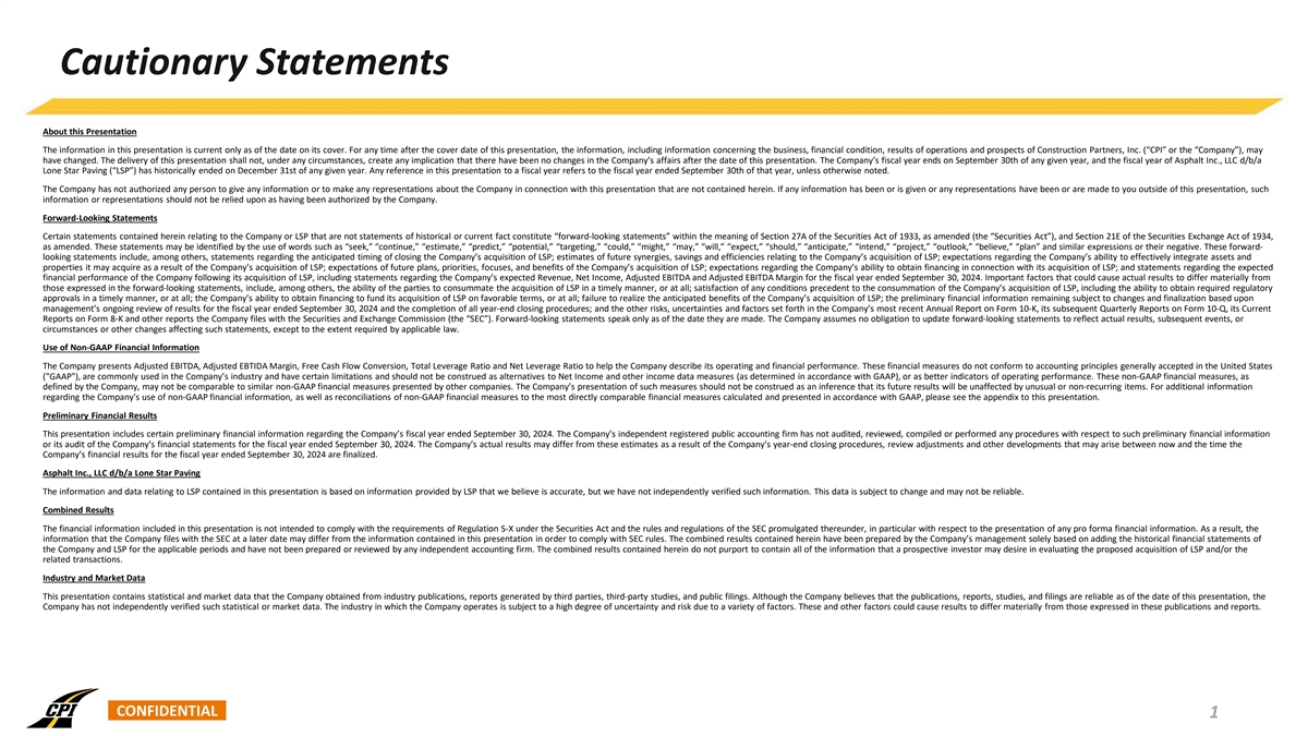 Cautionary Statements About this Presentation The information in this presentation is current only as of the date on its cover. For any time after the cover date of this presentation, the information, including information concerning the business, financial condition, results of operations and prospects of Construction Partners, Inc. (“CPI” or the “Company”), may have changed. The delivery of this presentation shall not, under any circumstances, create any implication that there have been no changes in the Company’s affairs after the date of this presentation. The Company’s fiscal year ends on September 30th of any given year, and the fiscal year of Asphalt Inc., LLC d/b/a Lone Star Paving (“LSP”) has historically ended on December 31st of any given year. Any reference in this presentation to a fiscal year refers to the fiscal year ended September 30th of that year, unless otherwise noted. The Company has not authorized any person to give any information or to make any representations about the Company in connection with this presentation that are not contained herein. If any information has been or is given or any representations have been or are made to you outside of this presentation, such information or representations should not be relied upon as having been authorized by the Company. Forward-Looking Statements Certain statements contained herein relating to the Company or LSP that are not statements of historical or current fact constitute “forward-looking statements” within the meaning of Section 27A of the Securities Act of 1933, as amended (the “Securities Act”), and Section 21E of the Securities Exchange Act of 1934, as amended. These statements may be identified by the use of words such as “seek,” “continue,” “estimate,” “predict,” “potential,” “targeting,” “could,” “might,” “may,” “will,” “expect,” “should,” “anticipate,” “intend,” “project,” “outlook,” “believe,” “plan” and similar expressions or their negative. These forward- looking statements include, among others, statements regarding the anticipated timing of closing the Company’s acquisition of LSP; estimates of future synergies, savings and efficiencies relating to the Company’s acquisition of LSP; expectations regarding the Company’s ability to effectively integrate assets and properties it may acquire as a result of the Company’s acquisition of LSP; expectations of future plans, priorities, focuses, and benefits of the Company’s acquisition of LSP; expectations regarding the Company’s ability to obtain financing in connection with its acquisition of LSP; and statements regarding the expected financial performance of the Company following its acquisition of LSP, including statements regarding the Company’s expected Revenue, Net Income, Adjusted EBITDA and Adjusted EBITDA Margin for the fiscal year ended September 30, 2024. Important factors that could cause actual results to differ materially from those expressed in the forward-looking statements, include, among others, the ability of the parties to consummate the acquisition of LSP in a timely manner, or at all; satisfaction of any conditions precedent to the consummation of the Company’s acquisition of LSP, including the ability to obtain required regulatory approvals in a timely manner, or at all; the Company’s ability to obtain financing to fund its acquisition of LSP on favorable terms, or at all; failure to realize the anticipated benefits of the Company’s acquisition of LSP; the preliminary financial information remaining subject to changes and finalization based upon management’s ongoing review of results for the fiscal year ended September 30, 2024 and the completion of all year-end closing procedures; and the other risks, uncertainties and factors set forth in the Company’s most recent Annual Report on Form 10-K, its subsequent Quarterly Reports on Form 10-Q, its Current Reports on Form 8-K and other reports the Company files with the Securities and Exchange Commission (the “SEC”). Forward-looking statements speak only as of the date they are made. The Company assumes no obligation to update forward-looking statements to reflect actual results, subsequent events, or circumstances or other changes affecting such statements, except to the extent required by applicable law. Use of Non-GAAP Financial Information The Company presents Adjusted EBITDA, Adjusted EBTIDA Margin, Free Cash Flow Conversion, Total Leverage Ratio and Net Leverage Ratio to help the Company describe its operating and financial performance. These financial measures do not conform to accounting principles generally accepted in the United States ( GAAP ), are commonly used in the Company’s industry and have certain limitations and should not be construed as alternatives to Net Income and other income data measures (as determined in accordance with GAAP), or as better indicators of operating performance. These non-GAAP financial measures, as defined by the Company, may not be comparable to similar non-GAAP financial measures presented by other companies. The Company’s presentation of such measures should not be construed as an inference that its future results will be unaffected by unusual or non-recurring items. For additional information regarding the Company's use of non-GAAP financial information, as well as reconciliations of non-GAAP financial measures to the most directly comparable financial measures calculated and presented in accordance with GAAP, please see the appendix to this presentation. Preliminary Financial Results This presentation includes certain preliminary financial information regarding the Company’s fiscal year ended September 30, 2024. The Company’s independent registered public accounting firm has not audited, reviewed, compiled or performed any procedures with respect to such preliminary financial information or its audit of the Company