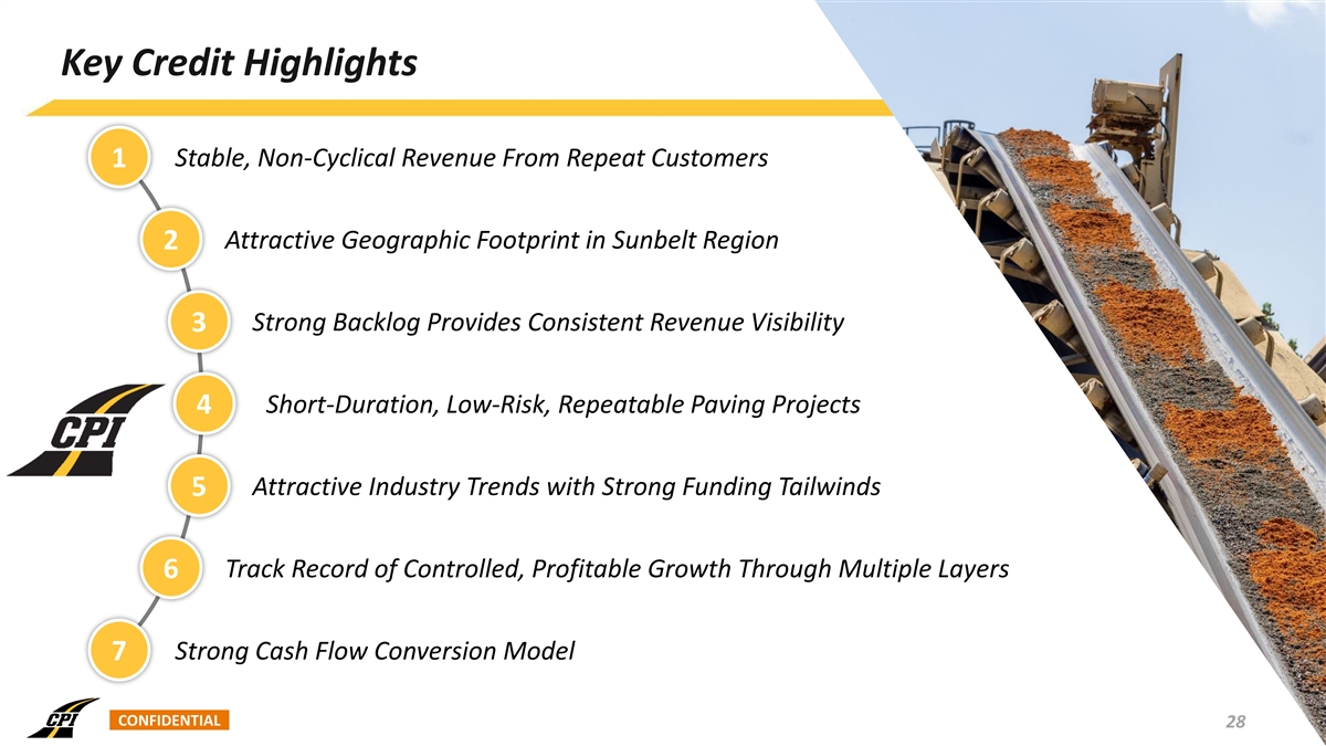 Key Credit Highlights 1 Stable, Non-Cyclical Revenue From Repeat Customers Attractive Geographic Footprint in Sunbelt Region 2 3 Strong Backlog Provides Consistent Revenue Visibility Short-Duration, Low-Risk, Repeatable Paving Projects 4 5 Attractive Industry Trends with Strong Funding Tailwinds Track Record of Controlled, Profitable Growth Through Multiple Layers 6 7 Strong Cash Flow Conversion Model CONFIDENTIAL 28