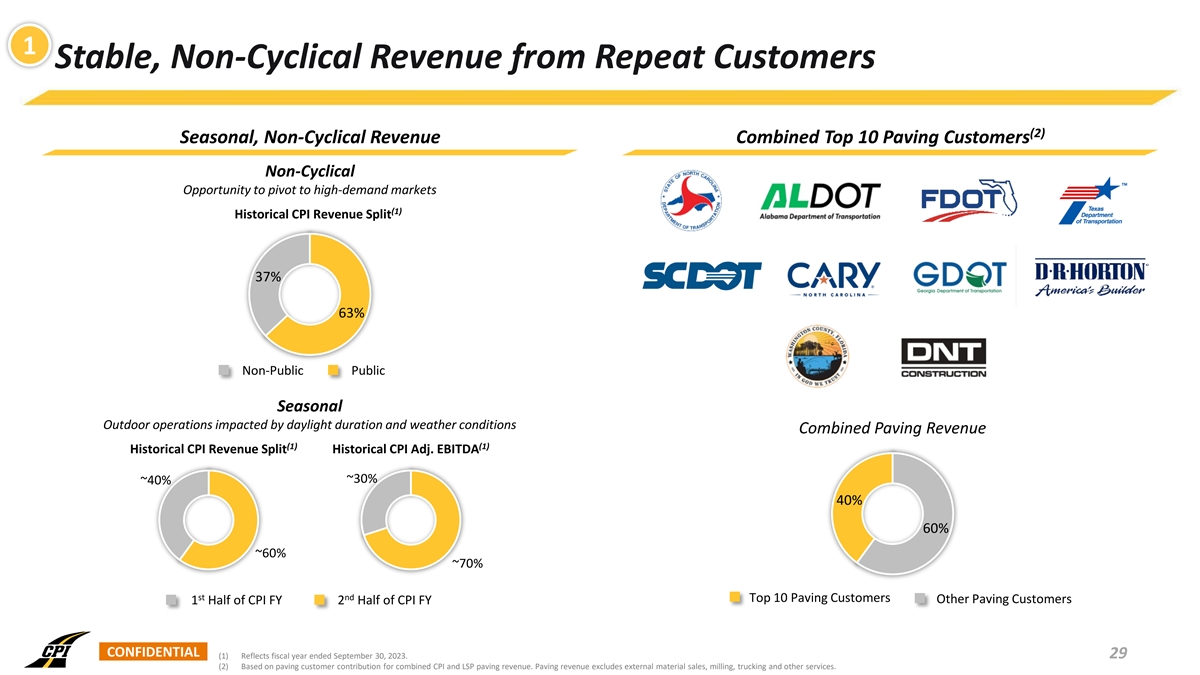 1 Stable, Non-Cyclical Revenue from Repeat Customers (2) Seasonal, Non-Cyclical Revenue Combined Top 10 Paving Customers Non-Cyclical Opportunity to pivot to high-demand markets (1) Historical CPI Revenue Split 37% 63% Non-Public Public Seasonal Outdoor operations impacted by daylight duration and weather conditions Combined Paving Revenue (1) (1) Historical CPI Revenue Split Historical CPI Adj. EBITDA ~30% ~40% 40% 60% ~60% ~70% st nd Top 10 Paving Customers Other Paving Customers 1 Half of CPI FY 2 Half of CPI FY CONFIDENTIAL (1) Reflects fiscal year ended September 30, 2023. 29 (2) Based on paving customer contribution for combined CPI and LSP paving revenue. Paving revenue excludes external material sales, milling, trucking and other services.