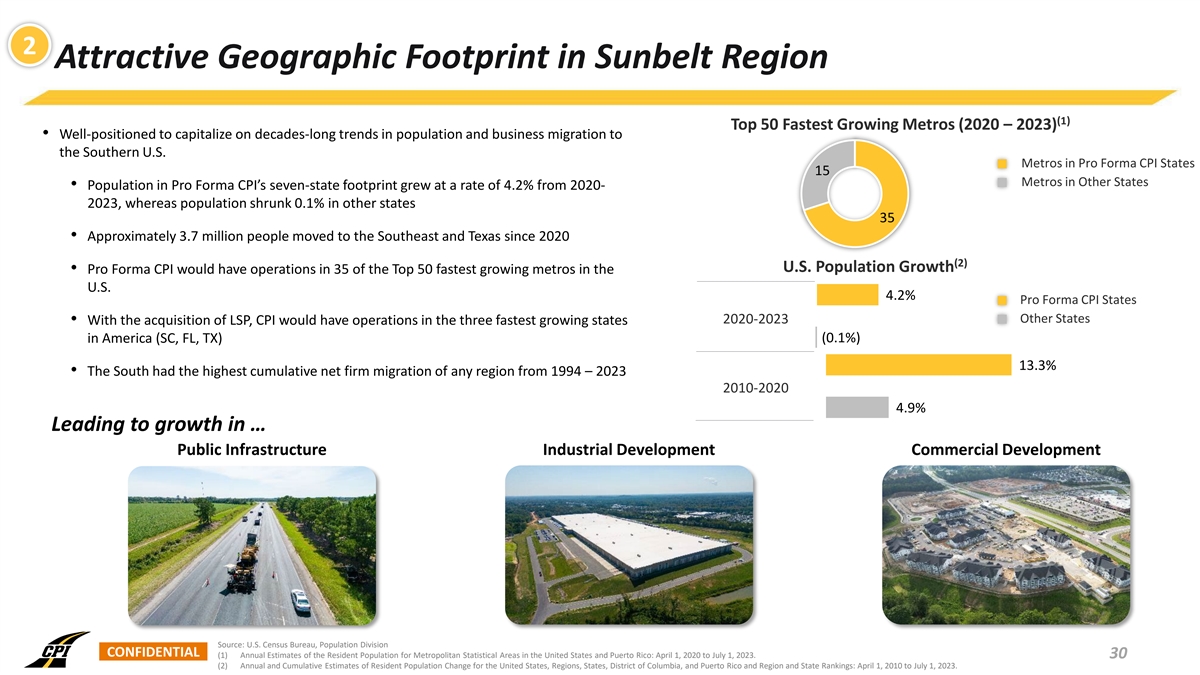 2 Attractive Geographic Footprint in Sunbelt Region (1) Top 50 Fastest Growing Metros (2020 – 2023) • Well-positioned to capitalize on decades-long trends in population and business migration to the Southern U.S. Metros in Pro Forma CPI States 15 Metros in Other States • Population in Pro Forma CPI’s seven-state footprint grew at a rate of 4.2% from 2020- 2023, whereas population shrunk 0.1% in other states 35 • Approximately 3.7 million people moved to the Southeast and Texas since 2020 (2) U.S. Population Growth • Pro Forma CPI would have operations in 35 of the Top 50 fastest growing metros in the U.S. 4.2% Pro Forma CPI States Other States 2020-2023 • With the acquisition of LSP, CPI would have operations in the three fastest growing states in America (SC, FL, TX) (0.1%) 13.3% • The South had the highest cumulative net firm migration of any region from 1994 – 2023 2010-2020 4.9% Leading to growth in … Public Infrastructure Industrial Development Commercial Development Source: U.S. Census Bureau, Population Division CONFIDENTIAL (1) Annual Estimates of the Resident Population for Metropolitan Statistical Areas in the United States and Puerto Rico: April 1, 2020 to July 1, 2023. 30 (2) Annual and Cumulative Estimates of Resident Population Change for the United States, Regions, States, District of Columbia, and Puerto Rico and Region and State Rankings: April 1, 2010 to July 1, 2023.