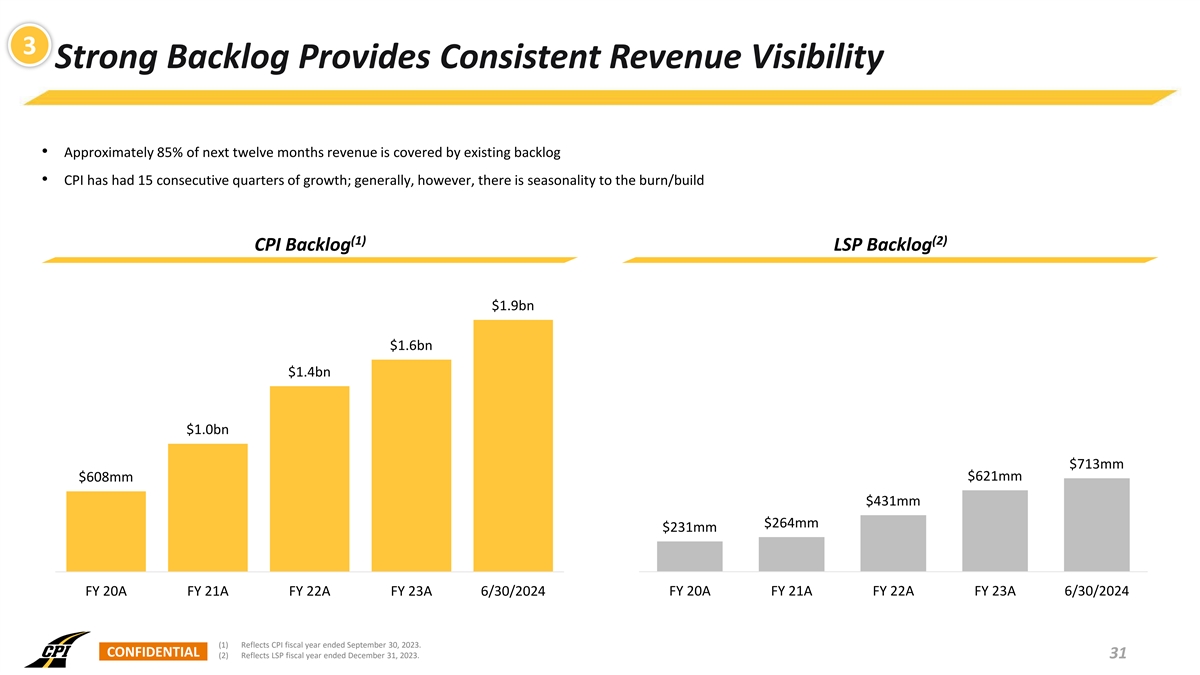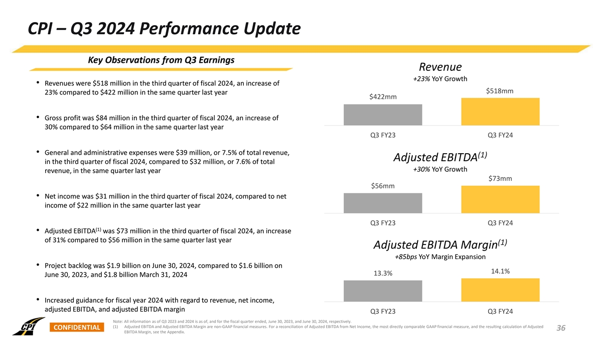 CPI – Q3 2024 Performance Update Key Observations from Q3 Earnings Revenue +23% YoY Growth • Revenues were $518 million in the third quarter of fiscal 2024, an increase of $518mm 23% compared to $422 million in the same quarter last year $422mm • Gross profit was $84 million in the third quarter of fiscal 2024, an increase of 30% compared to $64 million in the same quarter last year Q3 FY23 Q3 FY24 • General and administrative expenses were $39 million, or 7.5% of total revenue, (1) Adjusted EBITDA in the third quarter of fiscal 2024, compared to $32 million, or 7.6% of total +30% YoY Growth revenue, in the same quarter last year $73mm $56mm • Net income was $31 million in the third quarter of fiscal 2024, compared to net income of $22 million in the same quarter last year Q3 FY23 Q3 FY24 (1) • Adjusted EBITDA was $73 million in the third quarter of fiscal 2024, an increase of 31% compared to $56 million in the same quarter last year (1) Adjusted EBITDA Margin +85bps YoY Margin Expansion • Project backlog was $1.9 billion on June 30, 2024, compared to $1.6 billion on 14.1% 13.3% June 30, 2023, and $1.8 billion March 31, 2024 • Increased guidance for fiscal year 2024 with regard to revenue, net income, adjusted EBITDA, and adjusted EBITDA margin Q3 FY23 Q3 FY24 Note: All information as of Q3 2023 and 2024 is as of, and for the fiscal quarter ended, June 30, 2023, and June 30, 2024, respectively. (1) Adjusted EBITDA and Adjusted EBITDA Margin are non-GAAP financial measures. For a reconciliation of Adjusted EBITDA from Net Income, the most directly comparable GAAP financial measure, and the resulting calculation of Adjusted CONFIDENTIAL 36 EBITDA Margin, see the Appendix.
