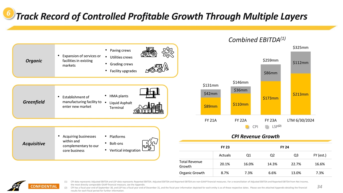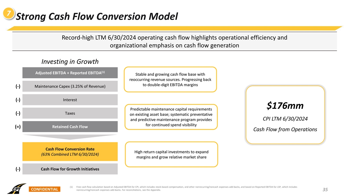 6 Track Record of Controlled Profitable Growth Through Multiple Layers (1) Combined EBITDA $325mm • Paving crews • Expansion of services or • Utilities crews facilities in existing $259mm Organic $112mm • Grading crews markets • Facility upgrades $86mm $146mm $131mm $36mm $42mm $213mm • HMA plants • Establishment of $173mm manufacturing facility to Greenfield • Liquid Asphalt $110mm $89mm enter new market Terminal FY 21A FY 22A FY 23A LTM 6/30/2024 (2) CPI LSP • Acquiring businesses • Platforms CPI Revenue Growth within and • Bolt-ons Acquisitive complementary to our FY 23 FY 24 • Vertical integration core business Actuals Q1 Q2 Q3 FY (est.) Total Revenue 20.1% 16.0% 14.3% 22.7% 16.6% Growth Organic Growth 8.7% 7.3% 6.6% 13.0% 7.3% (1) CPI data represents Adjusted EBITDA and LSP data represents Reported EBITDA. Adjusted EBITDA and Reported EBITDA are non-GAAP financial measures. For a reconciliation of Adjusted EBITDA and Reported EBITDA from Net Income, the most directly comparable GAAP financial measure, see the Appendix. CONFIDENTIAL 34 (2) CPI has a fiscal year end of September 30, and LSP has a fiscal year end of December 31, and the fiscal year information depicted for each entity is as of those respective dates. Please see the attached Appendix detailing the financial results for each fiscal period for further information.