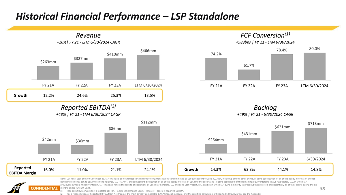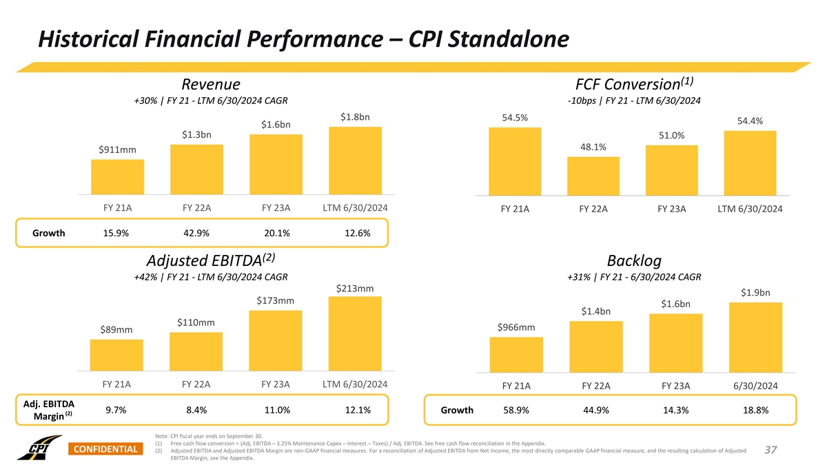 Historical Financial Performance – CPI Standalone (1) Revenue FCF Conversion +30% | FY 21 - LTM 6/30/2024 CAGR -10bps | FY 21 - LTM 6/30/2024 $1.8bn 54.5% 54.4% $1.6bn $1.3bn 51.0% 48.1% $911mm FY 21A FY 22A FY 23A LTM 6/30/2024 FY 21A FY 22A FY 23A LTM 6/30/2024 Growth 15.9% 42.9% 20.1% 12.6% (2) Adjusted EBITDA Backlog +42% | FY 21 - LTM 6/30/2024 CAGR +31% | FY 21 - 6/30/2024 CAGR $213mm $1.9bn $173mm $1.6bn $1.4bn $110mm $966mm $89mm FY 21A FY 22A FY 23A LTM 6/30/2024 FY 21A FY 22A FY 23A 6/30/2024 Adj. EBITDA 9.7% 8.4% 11.0% 12.1% Growth 58.9% 44.9% 14.3% 18.8% (2) Margin Note: CPI fiscal year ends on September 30. (1) Free cash flow conversion = (Adj. EBITDA – 3.25% Maintenance Capex – Interest – Taxes) / Adj. EBITDA. See free cash flow reconciliation in the Appendix. CONFIDENTIAL (2) Adjusted EBITDA and Adjusted EBITDA Margin are non-GAAP financial measures. For a reconciliation of Adjusted EBITDA from Net Income, the most directly comparable GAAP financial measure, and the resulting calculation of Adjusted 37 EBITDA Margin, see the Appendix.