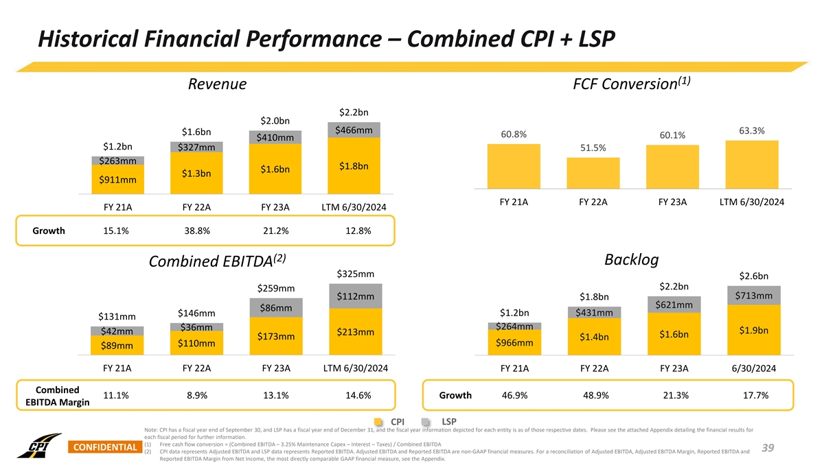 Historical Financial Performance – Combined CPI + LSP (1) Revenue FCF Conversion $2.2bn $2.0bn $466mm 63.3% $1.6bn 60.8% 60.1% $410mm $1.2bn $327mm 51.5% $263mm $1.8bn $1.6bn $1.3bn $911mm FY 21A FY 22A FY 23A LTM 6/30/2024 FY 21A FY 22A FY 23A LTM 6/30/2024 Growth 15.1% 38.8% 21.2% 12.8% (2) Backlog Combined EBITDA $325mm $2.6bn $2.2bn $259mm $713mm $112mm $1.8bn $621mm $86mm $146mm $1.2bn $431mm $131mm $264mm $36mm $1.9bn $42mm $213mm $1.6bn $173mm $1.4bn $110mm $966mm $89mm FY 21A FY 22A FY 23A LTM 6/30/2024 FY 21A FY 22A FY 23A 6/30/2024 Combined 11.1% 8.9% 13.1% 14.6% Growth 46.9% 48.9% 21.3% 17.7% EBITDA Margin CPI LSP Note: CPI has a fiscal year end of September 30, and LSP has a fiscal year end of December 31, and the fiscal year information depicted for each entity is as of those respective dates. Please see the attached Appendix detailing the financial results for each fiscal period for further information. (1) Free cash flow conversion = (Combined EBITDA – 3.25% Maintenance Capex – Interest – Taxes) / Combined EBITDA CONFIDENTIAL 39 (2) CPI data represents Adjusted EBITDA and LSP data represents Reported EBITDA. Adjusted EBITDA and Reported EBITDA are non-GAAP financial measures. For a reconciliation of Adjusted EBITDA, Adjusted EBITDA Margin, Reported EBITDA and Reported EBITDA Margin from Net Income, the most directly comparable GAAP financial measure, see the Appendix.