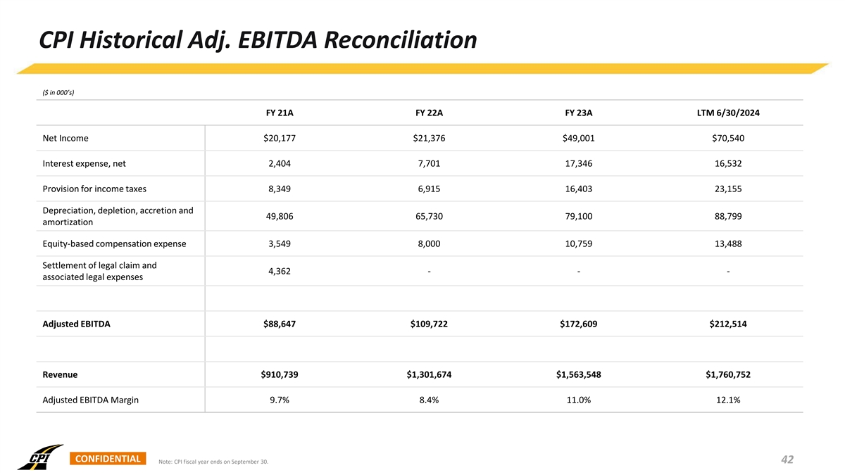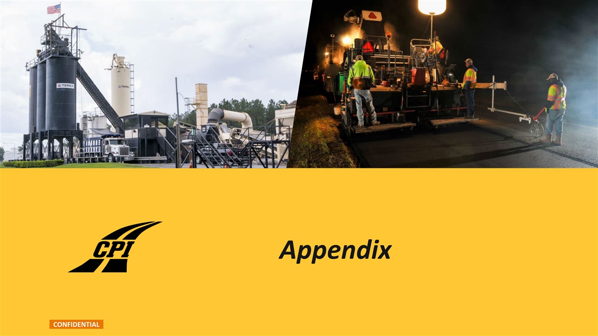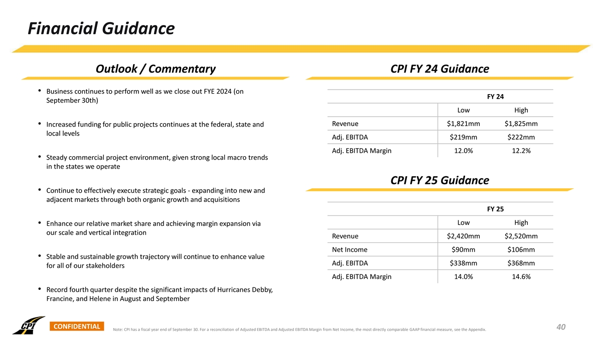 Financial Guidance Outlook / Commentary CPI FY 24 Guidance • Business continues to perform well as we close out FYE 2024 (on FY 24 September 30th) Low High Revenue $1,821mm $1,825mm • Increased funding for public projects continues at the federal, state and local levels Adj. EBITDA $219mm $222mm Adj. EBITDA Margin 12.0% 12.2% • Steady commercial project environment, given strong local macro trends in the states we operate CPI FY 25 Guidance • Continue to effectively execute strategic goals - expanding into new and adjacent markets through both organic growth and acquisitions FY 25 Low High • Enhance our relative market share and achieving margin expansion via our scale and vertical integration Revenue $2,420mm $2,520mm Net Income $90mm $106mm • Stable and sustainable growth trajectory will continue to enhance value Adj. EBITDA $338mm $368mm for all of our stakeholders Adj. EBITDA Margin 14.0% 14.6% • Record fourth quarter despite the significant impacts of Hurricanes Debby, Francine, and Helene in August and September CONFIDENTIAL 40 Note: CPI has a fiscal year end of September 30. For a reconciliation of Adjusted EBITDA and Adjusted EBITDA Margin from Net Income, the most directly comparable GAAP financial measure, see the Appendix.