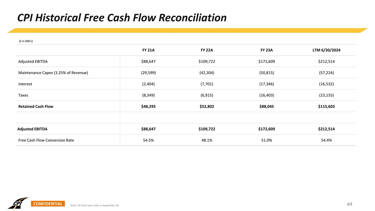 CPI Historical Free Cash Flow Reconciliation ($ in 000’s) FY 21A FY 22A FY 23A LTM 6/30/2024 Adjusted EBITDA $88,647 $109,722 $172,609 $212,514 Maintenance Capex (3.25% of Revenue) (29,599) (42,304) (50,815) (57,224) (2,404) (7,701) (17,346) (16,532) Interest Taxes (8,349) (6,915) (16,403) (23,155) Retained Cash Flow $48,295 $52,802 $88,045 $115,603 Adjusted EBITDA $88,647 $109,722 $172,609 $212,514 54.5% 48.1% 51.0% 54.4% Free Cash Flow Conversion Rate CONFIDENTIAL 44 Note: CPI fiscal year ends on September 30.