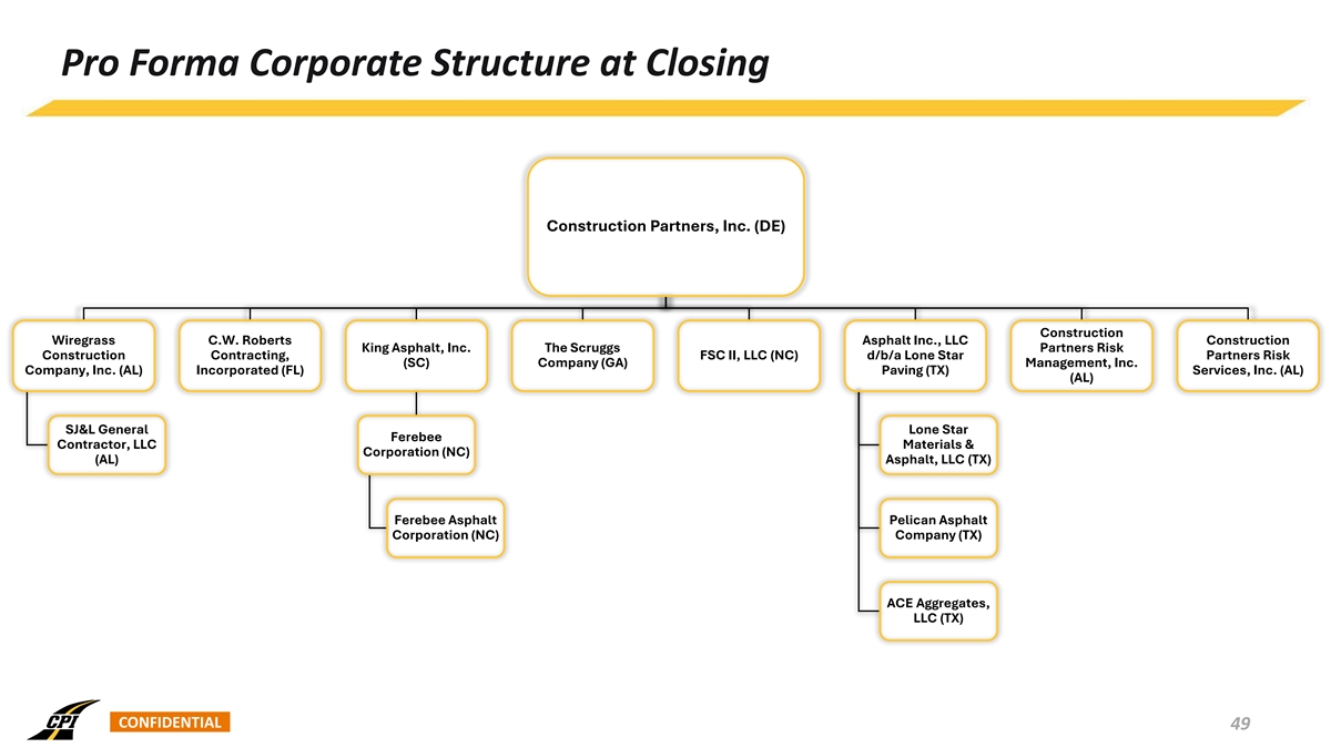 Pro Forma Corporate Structure at Closing Construction Partners, Inc. (DE) Construction Wiregrass C.W. Roberts Asphalt Inc., LLC Construction King Asphalt, Inc. The Scruggs Partners Risk Construction Contracting, FSC II, LLC (NC) d/b/a Lone Star Partners Risk (SC) Company (GA) Management, Inc. Company, Inc. (AL) Incorporated (FL) Paving (TX) Services, Inc. (AL) (AL) SJ&L General Lone Star Ferebee Contractor, LLC Materials & Corporation (NC) (AL) Asphalt, LLC (TX) Ferebee Asphalt Pelican Asphalt Corporation (NC) Company (TX) ACE Aggregates, LLC (TX) CONFIDENTIAL 49