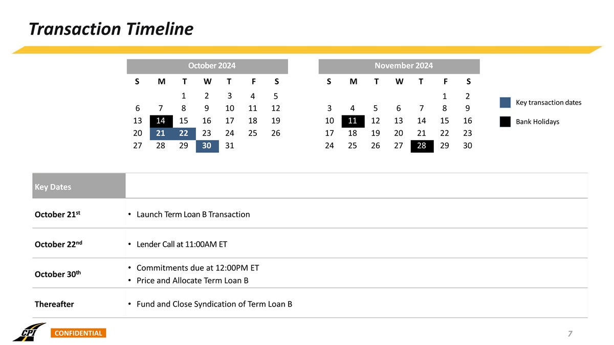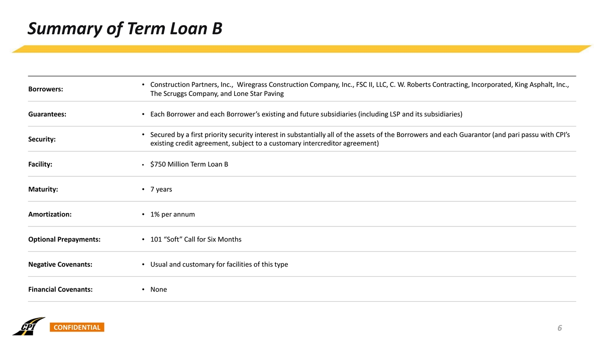 Summary of Term Loan B • Construction Partners, Inc., Wiregrass Construction Company, Inc., FSC II, LLC, C. W. Roberts Contracting, Incorporated, King Asphalt, Inc., Borrowers: The Scruggs Company, and Lone Star Paving Guarantees: • Each Borrower and each Borrower’s existing and future subsidiaries (including LSP and its subsidiaries) • Secured by a first priority security interest in substantially all of the assets of the Borrowers and each Guarantor (and pari passu with CPI’s Security: existing credit agreement, subject to a customary intercreditor agreement) Facility: $750 Million Term Loan B • Maturity: 7 years • Amortization: 1% per annum • Optional Prepayments: • 101 “Soft” Call for Six Months Negative Covenants: • Usual and customary for facilities of this type Financial Covenants: • None CONFIDENTIAL 6